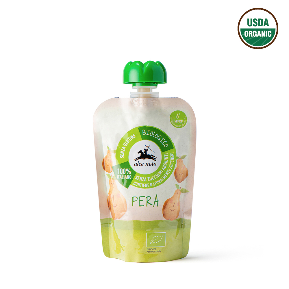 Alce Nero pear purée without added sugars contains natural sugars and is gluten free. It is also ideal away from home, thanks to the practical squeeze pouch